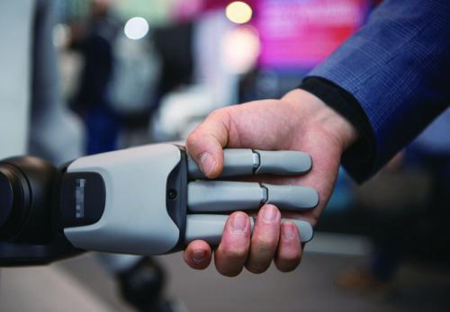 21일, 독일 하노버 산업박람회에서 한 남성이 로보트와 악수를 나누고 있다. 2026년 독일 하노버 산업박람회가 20일부터 24일까지 개최되는 가운데 인간형 로보트가 핵심 전시내용의 하나로 눈길을 끌었다.
