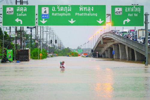 25일, 한 남자가 타이 핫야이시 교외에서 홍수에 잠긴 길을 건너고 있다. 타이 재해방지청은 25일 통보를 발표하여 련일 이어진 홍수 피해로 41명이 숨지고 268만명이 넘는 사람들이 영향을 받았다고 밝혔다.