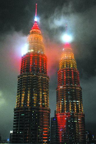 16일, 말레이시아 수도 꾸알라룸뿌르의 말레이시아국가석유회사 쌍둥이 빌딩이 음력설 주제의 붉은빛 조명으로 단장하고 음력설을 맞이하고 있다.