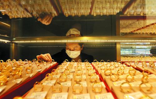 1월 26일, 뉴욕상품교역소 황금선물가격과 런던 현물황금가격이 각기 온스당 5100딸라의 선을 돌파하면서 국제황금가격이 또다시 사상 최고치를 갱신했다. 이날 강소성 련운항시 련운구에 있는 한 황금판매점에서 직원이 황금장신구를 정돈하는 모습을 렌즈에 담았다.