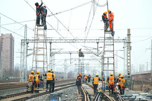 14일, 중국철도북경국그룹유한회사 천진전력공급구간에서 2026년 일반렬차 련결망 집중보수공사가 정식 가동되였다. 4월 중순까지 지속되는 이번 공사는 주로 진산선(천진-북당, 천진 북환상선 남창-북당) 련결망에 대해 전면 검사 및 정돈을 펼치게 된다. 사진은 이날 진산선 군량성역에서 보수작업중인 사업일군들의 모습이다.