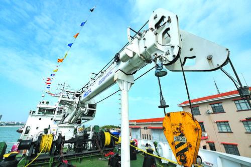 13일, 우리 나라에서 자주적으로 설계, 건설한 2000톤급 대형 항표선 ‘해순 176’호가 정식으로 교통운수부 남해항 보장중심에 편입되였다. 이 항표선은 전국 교통운수분야에서 가장 크고 가장 선진적인 항표작업선으로 향후 남해 바다의 항표 부설, 보수 임무를 수행하게 된다. 사진은 ‘해순 176’호에 설치되는 20톤짜리 액체압력 기중기 모습이다.
