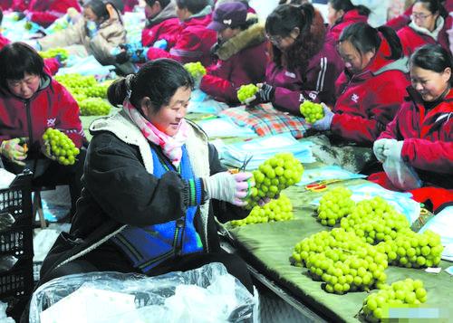 최근 하북성 진주시가 과일수출 성수기를 맞이했다. 배, 포도, 자두 등 진주의 년간 과일생산량은 70만톤을 웃돌고 생산액은 17억원에 달한다. 8일 진주시의 한 과일수출기업 과일출하 라인에서 일하는 로동자들의 모습이다.