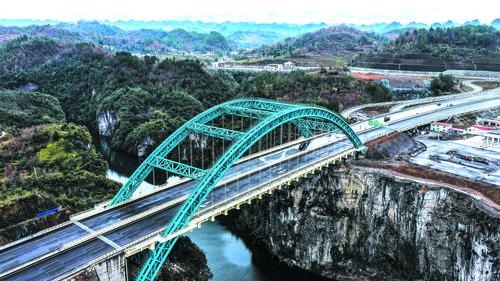 귀주교통투자그룹에서 건설한 귀양—평당(平塘) 고속도로가 검수에 순조롭게 통과되여 곧 운행될 예정이다. 귀평고속도로 대상은 총길이가 174.018킬로메터이며 시속 100킬로메터로 설계되였다. 사진은 24일 귀평고속도로 갑청특대교를 드론으로 촬영한 모습이다.