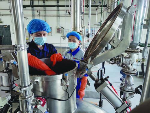 길림오동약업집단 연길주식유한회사에서 정월 초나흘부터 56명의 일군이 생산에 투입되기 시작했다. 사진은 정월 초닷새인 21일 일군들이 중약재 추출 작업장에서 약품 원료인 소회향을 투입하는 모습이다.